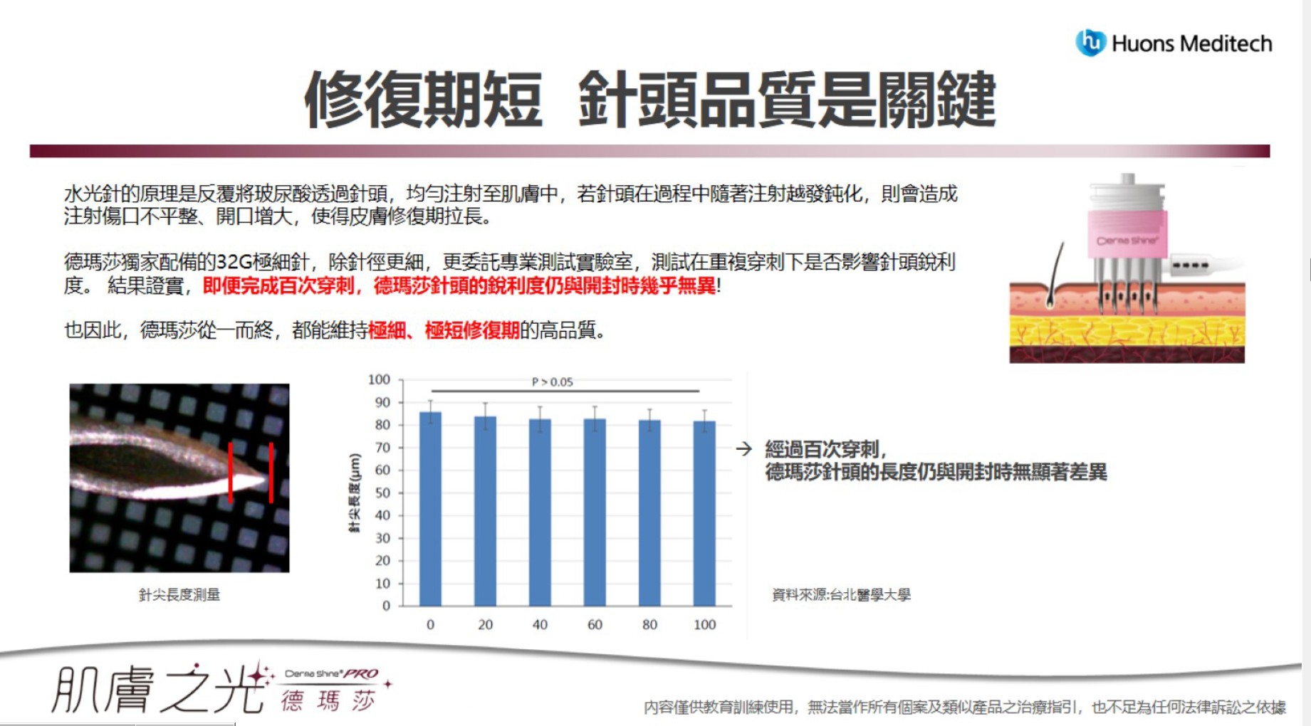 專業儀器的針頭品質是療程舒適度的重要指標。Dermashine Pro曾進行針頭銳利度測試,結果證明其銳利度遠優於市面上其他同類型產品。